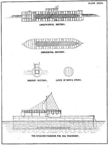 После того, как обелиск был освобожден от земли, вокруг него построили железную трубу длиной 92 фута и диаметром 16 футов. Обелиск был подвешен внутри неё на нескольких железных ребрах. Она была оснащена рулем и парусами, чтобы помочь стабилизировать обелиск во время путешествия по морю, и небольшой каютой для размещения экипажа.