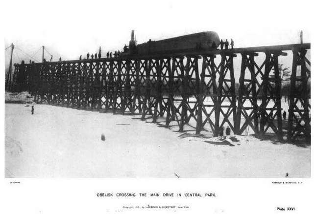 Используя систему деревянных эстакад, обелиск протащили через город сначала по 96-й улице до Бродвея, затем на юг до 86-й улицы. Там его снова повернули и направили в Центральный парк. Резкие перепады высот сделали пересечение парка изнурительной работой.