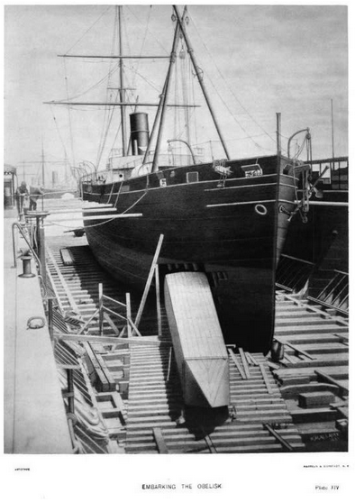 Как и французы, американцы возвели огромную систему рычагов и шкивов, и 6 декабря с некоторыми трудностями Игла Клеопатры была переведена в горизонтальное положение. Но рано было радоваться, что подвиг был совершен; еще три месяца ушло на то, чтобы обелиск спустили на деревянную дорожку, что позволило транспортировать его на воду.