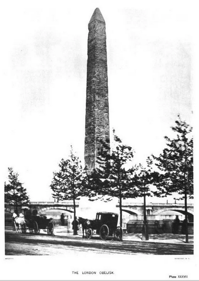 Подобный обелиск стоит на северном берегу Темзы в Лондоне, этот обелиск местами изношен веками насилия и испещрен шрапнелью от бомбы Первой мировой войны. Его близнец находится на другом берегу Атлантического океана, на холме позади Музея искусств Метрополитен в Центральном парке Нью-Йорка. Во всех трех местах обелиски намного старше городов, в которых они стоят.
