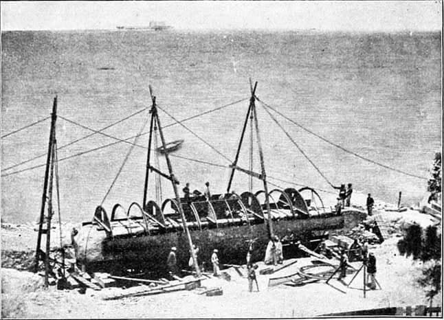 Туманным утром 28 августа 1877 года два паровых буксира были прикованы цепями к трубе, которую окрестили «Клеопатрой», и попытались вывести ее в море. Он необъяснимым образом начал поглощать воду, и дайверы обнаружили, что камень, спрятанный в песке, пробил его корпус. Чтобы отремонтировать, трубу пришлось перевернуть вверх дном, прежде чем она, наконец, могла начать плавание.