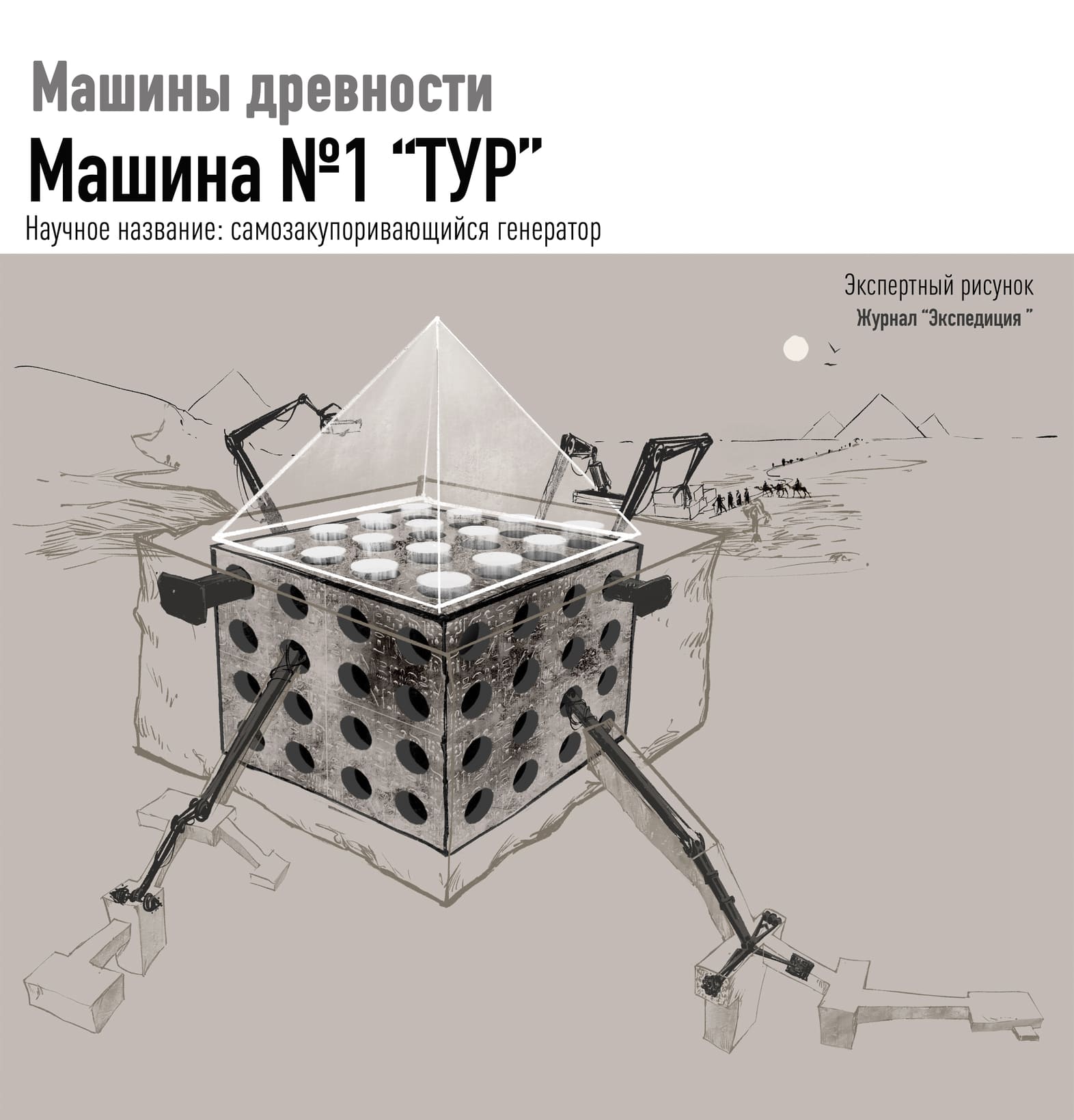 «Тур» — самая сложная машина, «самозакупоривающийся» генератор. Прототипологически его можно сопоставить с кубом Кааба (мусульманская святыня в Мекке). У «Тура» огромное количество функций, но главная – создание мемориальных комплексов; при этом, «Тур» является фундаментом для пирамид Хеопса, Хефрена и других. С помощью машины «Скорпион» вырывается котлован по размеру машины «Тур», краном «Скорпиона» она устанавливается внутрь котлована и дальше эта машина – робот, управляемый дистанционно – сама начинает строить пирамиду. Как она это делает?