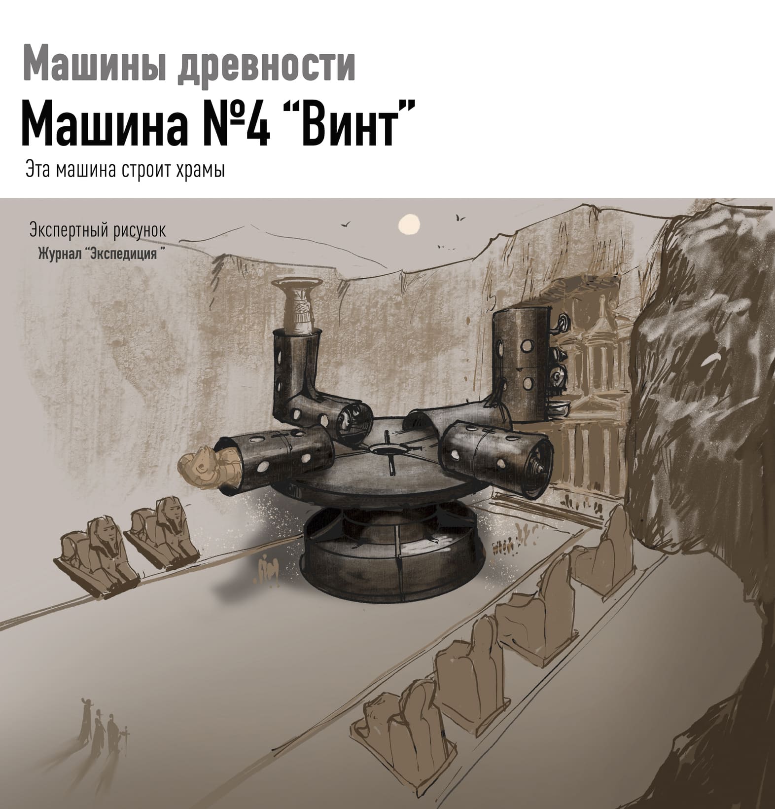 Данная машина строит храмы. Она выпиливает основания, обелиски прямо из скалы, двигаясь вниз/вверх (до 50 м). Машина разбивает скалу, выпиливает заготовку, ее помещает в трубу и дальше все происходит в трубе: резаки придают заготовке форму. «Винт» выпиливает любую статую из цельного куска породы – прямо из скалы. Для этого она способна подходить к скале в упор. Опустили трубу на породу – и двигающиеся резаки выпиливают породу в необходимый обелиск, статую или колонну. Говоря на языке нынешней техники – это принцип фрезерного и токарного станков. Сама труба (в диаметре около 6 метров) может раздвигаться до 48 метров в одну сторону. Уже готовые изделия перемещает по месту назначения машина «Скорпион».