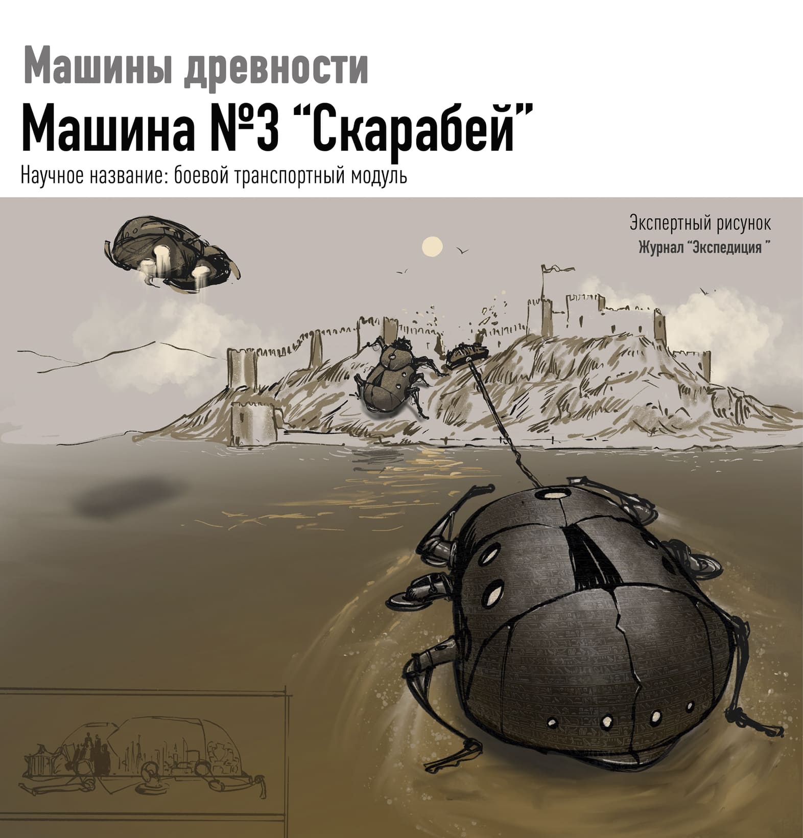 «Скарабей» — летающая машина, которая так же, как и «Тур», может иметь военное назначение. Боевой транспортный модуль имеет 3 способа движения: она может двигаться на воздушной подушке по пустыне или Нилу, может летать, может ползать/лазить вертикально по скалам при помощи передних и задних «лап». У машины три отсека: 1) управляющий, в котором находится десант (либо перемещение инструкторского и офицерского состава); 2) грузовой, для перевозки ценностей, 3) отсек для перевозки вооружения. Впереди у машины механический таран, который «выплёвывается» на 24 метра (выразимся образно) и пробивает любую машину. Он не просто врезается и ломает, он создаёт трап, по которому десант проникает в пробитую машину и ликвидирует экипаж. Предположительно, в «Скарабее» (около 26 метров в размерах) помещалось 8 человек: 2 летчика и 6 человек группы десанта.
