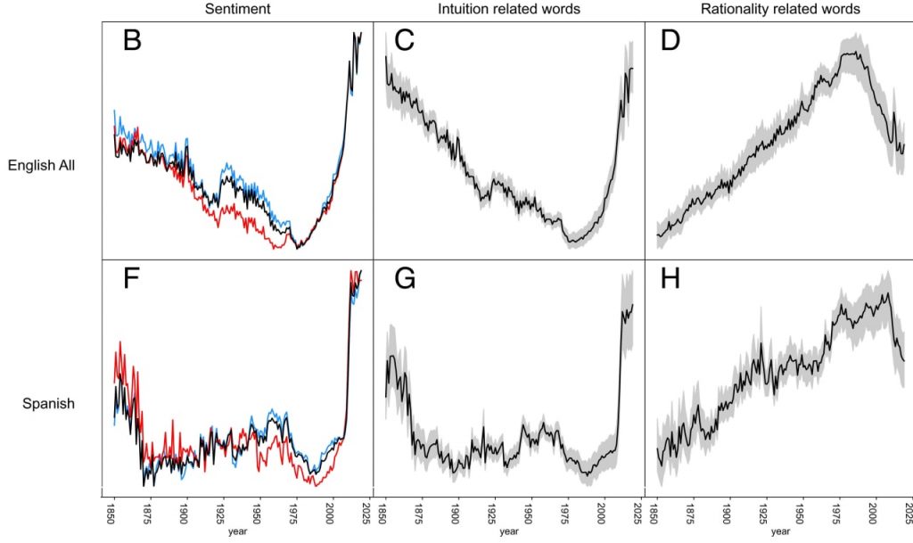 В ходе исследования они выяснили, что количество слов, связанных с рациональностью систематически росло после 1850 года, в то время как слов, отражающих человеческий опыт и чувства, становилось меньше. Примерно 50 лет назад – в 1970-1980-х годах — согласно графикам, ситуация изменилась на противоположную, а за последнее десятилетие произошел резкий скачек этой тенденции. Количество рациональных понятий в книжном языке стабильно, но относительно медленно падала почти три десятилетия, а затем, примерно в 2007-2008 году, процесс замены рациональных суждений на эмоциональные и резко ускорился. Такое явление наблюдается как в художественной, так и в научной литературе.