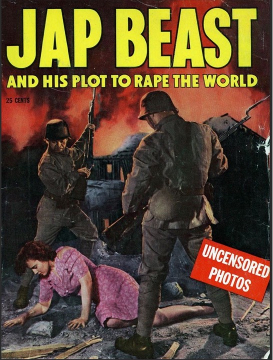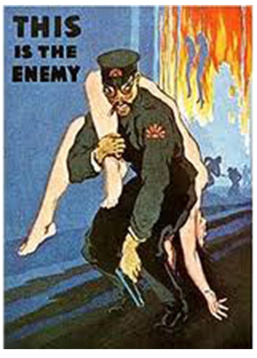«Во всех формах американской антияпонской пропаганды японцы уничижительно назывались «япошками» и изображались как жестокие обезьяны или некие паразиты, называемые «подлыми маленькими желтыми крысами». Японский обычай уважать авторитеты демонстрировался американской пропагандой как форма фанатизма, а японских иммигрантов в США также клеймили как людей, которым нельзя доверять. Американской общественности постоянно напоминали, что японцы напали на Перл-Харбор, «плохо обращались с военнопленными» и «совершали зверства». На пропагандистских плакатах японцы изображались в виде чудовищных обезьян, угрожающих чести Соединенных Штатов и/или белой американской женщине. Слова «подлый», «чудовище» и «японец» были написаны крупным жирным шрифтом. Крейсер под названием «Гонолулу», помнится, имел на носу надпись: «Убейте япошек. Убивайте япошек, убивайте больше япошек». Адмирал ВМС США Уильям Фредерик Хэлси, как сообщается, публично говорил о японцах как о «звероподобных обезьянах» и заявил: «Мы топим и сжигаем [их] по всему Тихому океану, и сжигать их — такое же удовольствие, как и топить». (PropagandaModule. 2016)