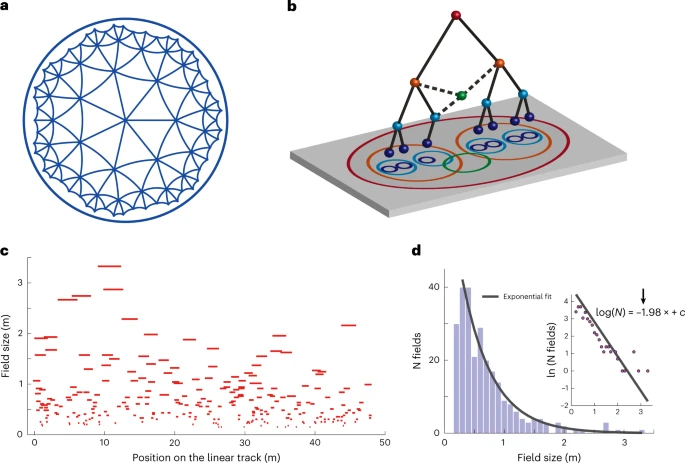 a — показана модель диска Пуанкаре двумерной гиперболической геометрии для визуализации ее сходства с древовидной структурой. Каждая кривая представляет собой геодезическую линию между двумя соединенными точками, и все треугольники имеют одинаковый размер. б — иллюстрация построения иерархического представления свойств нейронного ответа. Древовидная структура не обязательно должна быть идеальной, чтобы обеспечить отображение на гиперболическую геометрию. Некоторые петли могут присутствовать (штриховые линии) из-за частичного перекрытия дисков нейронов из разных порядков в иерархии. c — размер поля места в зависимости от расположения 264 полей места из 63 предполагаемых пирамидальных клеток из дорсальной области CA1 крысы, бегущей по линейной дорожке длиной 48 м (рис. 3b ).и дополнительный рисунок 1 ) 20 . d — гистограмма размеров поля мест, показанная на c . Серая линия показывает экспоненциальное соответствие максимальной вероятности. На вставке показан тот же график с логарифмической шкалой по оси Y. Прямая линия показывает линейную регрессию по методу наименьших квадратов.