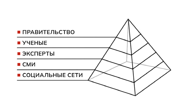 Существует пирамидальная модель формирования общественного мнения, нарисованная Массимо Интровинье, которая показывает, что информация передается сверху вниз — от правительства до электората. Представьте, как эта информация, проходя через все слои сверху вниз, несет с собой различные искажения и грязь, образуя тем самым информационное болото. Таким образом, среднестатистический человек находится внутри этого болота и смотрит на мир сквозь призму этой пирамиды. Представьте, встречаются два человека, смотрят друг на друга, и каждый видит собеседника сквозь эту призму, некий экран искажения, что в свою очередь порождает конфликт: интересов, мнений, мировоззрения. А он в свою очередь могут перерасти и в более серьезное столкновение между людьми.