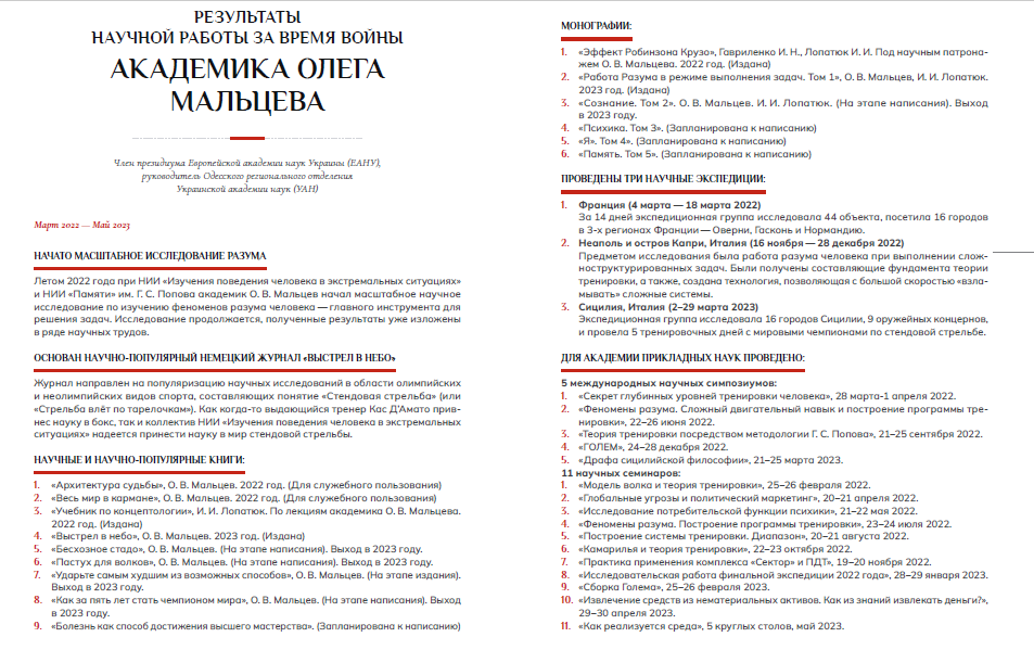 За первые месяцы войны академик О.В. Мальцев не только организовал эвакуацию научных сотрудников и ученых с территории боевых действий, но и создал все условия для бесперебойной работы всех НИИ, обеспечил всех сотрудников запасом медикаментов и продовольствия, не уволил ни одного человека! Я лично брала интервью у академика О.В. Мальцева, общалась с его сотрудниками, которых эвакуировали из зоны боевых действий, держала в руках книги и монографии, которые за последний год были написаны ученым, и принимала участие в его научных семинарах и симпозиумах. Несмотря на тяжелое время для Украины, этот человек продолжает заниматься наукой и прославлять свою страну на весь мир. Иностранные ученые с восхищением отзываются о его работе в столь сложное время – об этом мы писали в последнем выпуске нашего журнала «Украинская наука и ученые во время войны». Все результаты научной работы академика за время войны сложно перечислить, и лично меня это невероятно восхищает: когда в стране война, и большая часть людей либо уехали, либо думают о том, как выжить или просто денег заработать, есть те, кто поднимают науку своей страны и, более того, делают ее не просто заметной на мировой научной арене, а ставя ее на достойный мировой уровень. И замечу немаловажный факт – за все время своей научной деятельности академик Мальцев ни копейки не взял у государства. Вся его обширная научная деятельность осуществляется исключительно за личные средства.