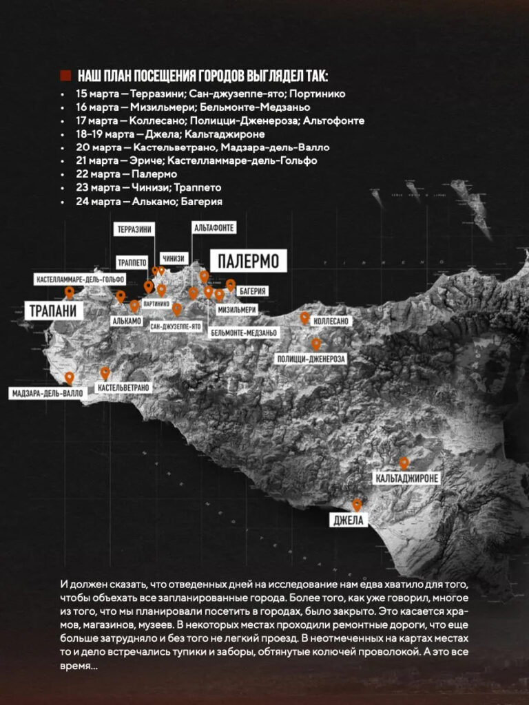 В ходе изысканий ответа на вопрос как же становятся Капо, экспедиционная группа посетила и исследовала 19 провинциальных городков Сицилии – именно они являются колыбелью боссов Мафии. И это очень любопытный вопрос: каким образом люди из провинций становятся авторитетами мирового уровня? Парадокс? Но, не спешите размышлять на эту тему, как говорит автор труда:
