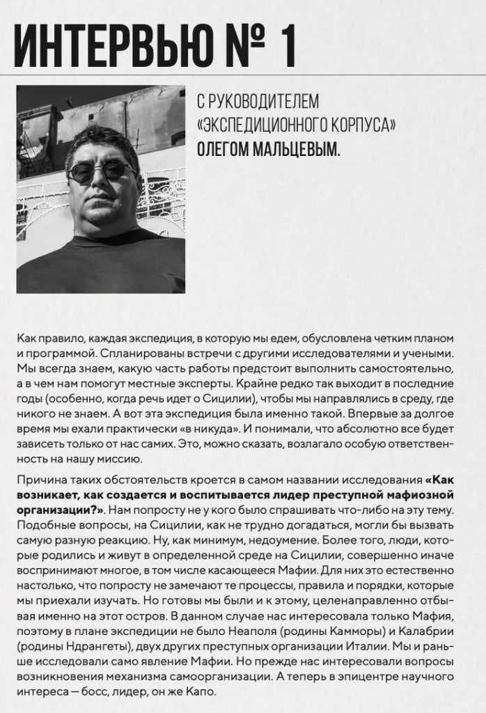 Среда погружения ученых была отнюдь не дружелюбная. Все-таки предметом исследования выступила одна из самых могущественных структур в мире, и к ее представителям нельзя просто подойти и задать все интересующие вопросы. Поэтому, для исследования технологической схемы, как же становятся Капо, нужна была специальная методология, которую Олег Мальцев сконструировал в самой экспедиции.