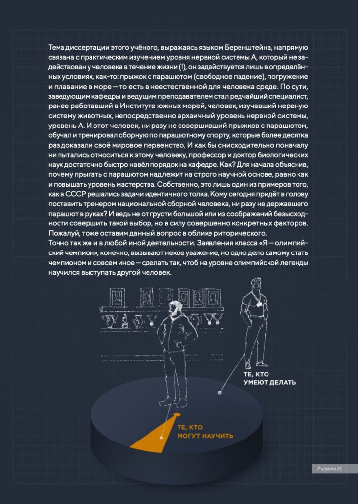 Другой момент. Читая книгу, мне очень понравился один рисунок – там изображена модель (круг), который обозначает примерно следующее: 80-90% людей в принципе могут что-то сделать, а всего лишь 10%-20% из них способны этому научить. Проблема заключается в том, что общество, в котором мы живем, развивается максимально динамично по сравнению со всеми предыдущими обществами. То есть если раньше какой-то навык мог функционировать и сохранять свою актуальность 100-200 лет или даже больше, то сейчас это не так.