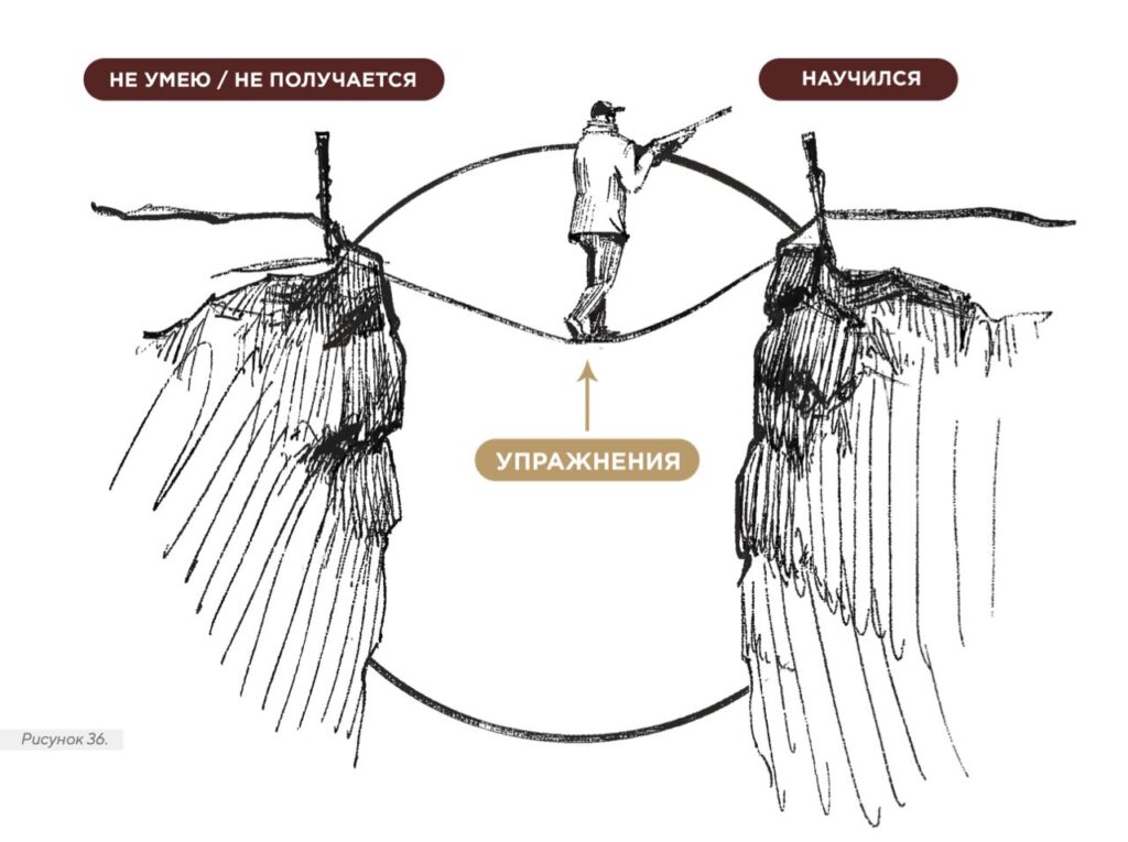 Вспоминаю одну из иллюстраций в книге, где человек изображен на мостике между скалами, учась чему-то новому. Парадоксально, но именно будучи в подвешенном состоянии, можно научиться и освоить новые навыки. Опора становится жизненно важной, представляющей собой две точки, которые удерживают его канат, веревку или мостик, на котором человек себя «обнаруживает». Не просто находиться на определенном уровне, а обнаруживает себя в этой точке — вот в чем суть важности разума. Фокусировка на этом моменте играет ключевую роль в процессе обучения и развития.
